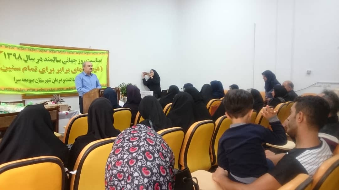 به مناسبت هفته سالمند وباهمکاری سازمان بهزیستی پیش از ظهر امروز 9 مهرماه همایشی با عنوان سلامت سالمندی ، با شعار فرصت های برابر برای تمام سنین در سالن اجتماعات مرکز بهداشت صومعه سرا برگزار شد .